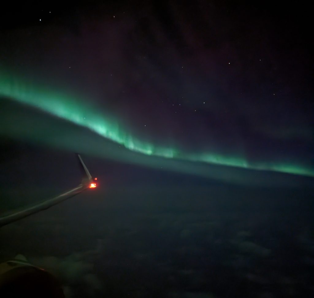 Po našem rozhovoru nás další člen posádky upozorňuje, že dostáváme první očekávané záblesky polární záře. Tohle je pro mě poprvé, takže se vracím rovnou do kokpitu a světla v kabině jsou ztlumená pro lepší výhled. Příroda nezklame a téměř dvě hodiny nás čeká skvělá světelná show.