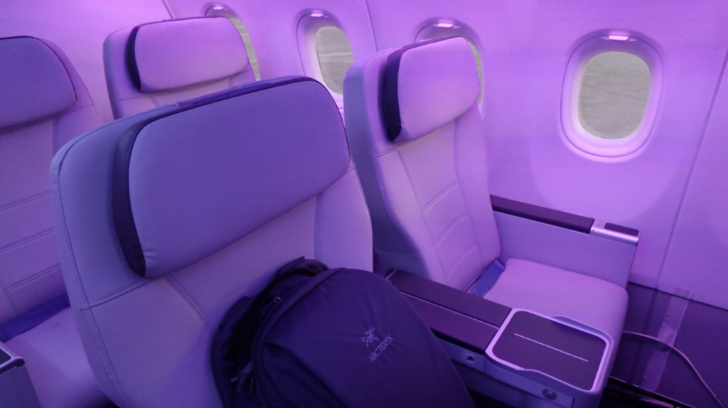 Po další bezpečnostní instruktáži od inženýra pozemních zkoušek Hervé se usadíme na svá místa v kabině v části „business class“. Alpha Bravo je jedním ze tří zkušebních letadel Airbus A321XLR, ale jediný plně vybavený sedadly pro cestující ve smíšené třídě. Toto je letadlo, které bude zanedlouho testovat plnou simulovanou zátěž cestujících až 200 lidí.