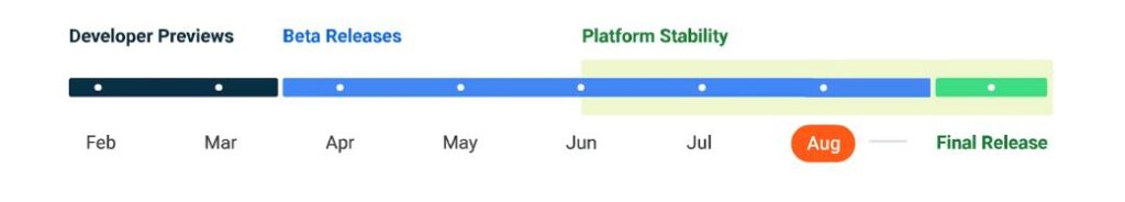 V červnu cestovní mapa ukazuje, že Android 14 dosáhl stability platformy s třetí beta verzí. To znamená, že vývojáři mohou aktualizovat své aplikace pomocí nových funkcí a rozhraní API představených v Androidu 14, aniž by se museli starat o další změny před vydáním. Čtvrtá beta dorazila v červenci a 10. srpna 2023 jsme dostali překvapivou beta 5 se dvěma vydáními, která následovala krátce poté. Google odpovídajícím způsobem aktualizoval svou časovou osu, a proto můžete toto dříve neplánované vydání vidět v grafu výše.